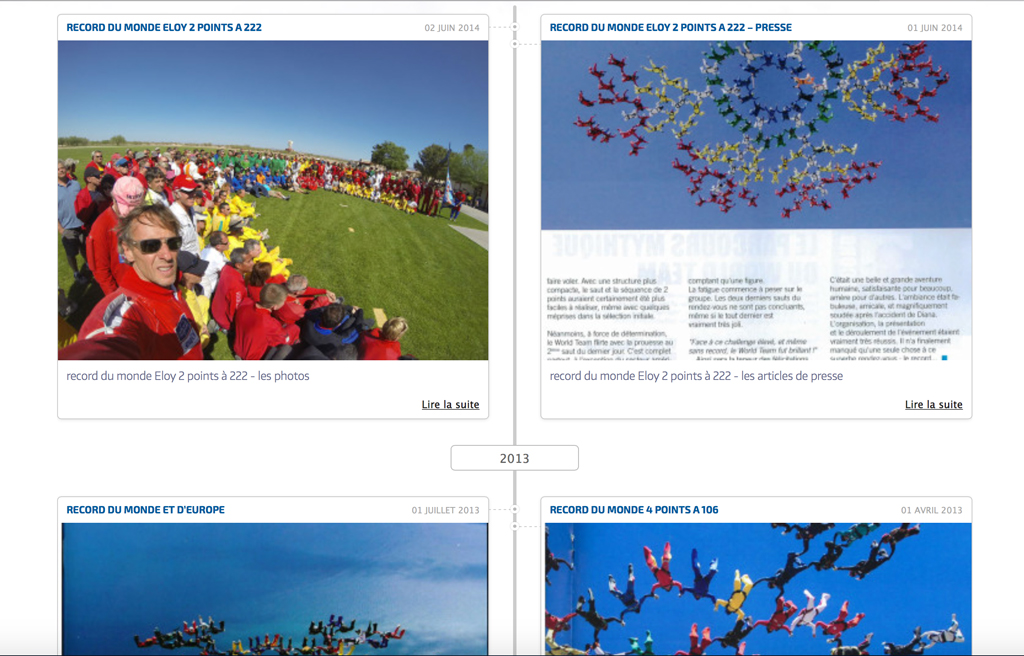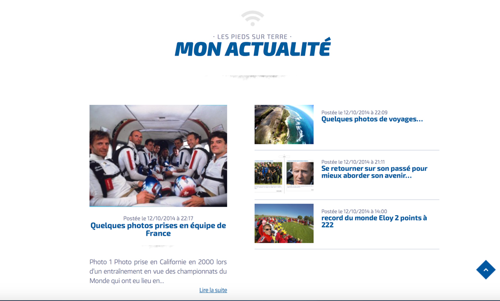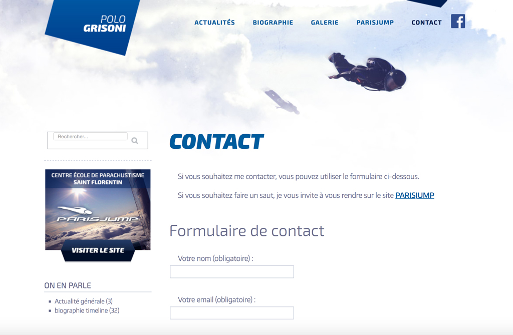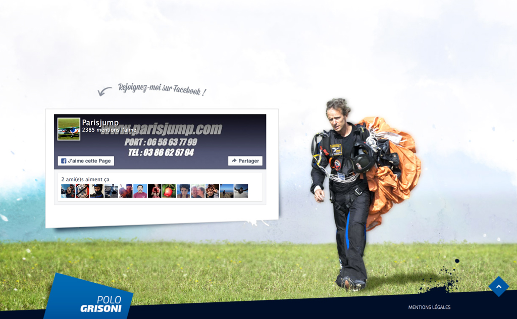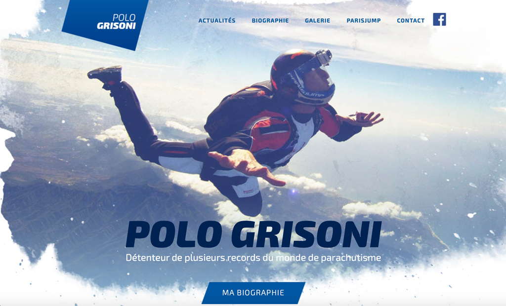 olo Grisoni est vice-champion du monde et multiple recordman du monde de parachutisme, nous lui avons mis en place un site web afin de promouvoir sa personnalité hors norme auprès de sa communauté de fans afin de les orienter en faisant le lien avec la centre de parachutisme qu’il manage en Bourgogne : l’école Parisjump.